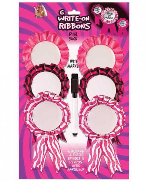 Bachelorette Ribbons with write on pins. 2 inches write on surface. Marker included. Set of 6. From Forum Novelties.