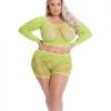Pink Lipstick brings you the summer! The set consisting of a net top and a net string is made of nylon and sits almost like a second skin, the embroidery of hemp leaves leaves Festival feelings arise. The special highlight: Your new set shines in the black light!Color: WhiteS/M. Bust: 32in.-36in. Waist: 24in.-28in. Hip: 34in.-38in. Cup: A/B. Dress: 4-8