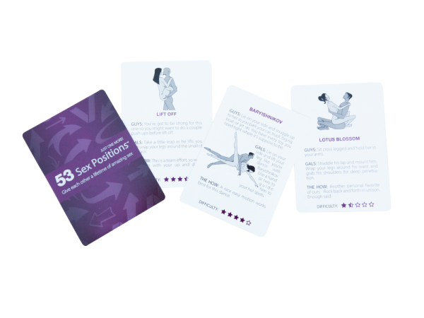 The Naughty Appetites 53 Sex Positions Card Game. Give each other a lifetime of amazing sex. We know you love sex. In fact, youre probably even having great sex. But who doesnt want to improve their game in and out of bed and take it to a whole new level? 53 Sex Positions – just one more, is the only deck of cards created to intensify love making and ignite a lifetime of amazing sex like never before! Each card includes an illustration with simple step by step instructions. Weve even rated each position, but well let you be the ultimate judge.