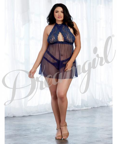 Sheer Mesh and Lace Halter Babydoll with Panty from Dreamgirl lingerie Red Diamond line. Color Midnight Black, Blue. Ladies plus sizes, one size queen. Sizes 16 to 20. Cups D/DD. Bust 40 inches to 54 inches. Waist 36 inches to 44 inches. Hips 42 inches to 56 inches. Weight 165 pounds to 275 pounds.